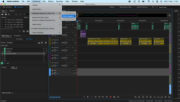 As This Effect Didn’t Work Out, I Decided To Try Another Way To Get The Audio Levels To The Same As Apple Podcasts. The First Thing That I Did To Do This Was Go Up To The Multitrack Section At The Top Of The Software Where I Selected Mixdown Session To New File Which Came Up With A Drop-Down Menu Where I Selected Entire Session.